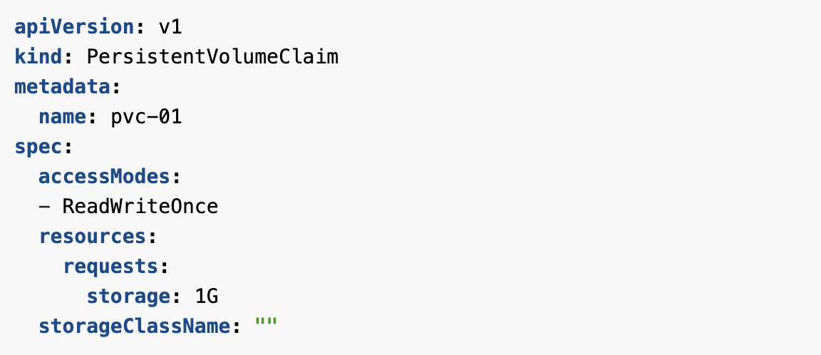 각각 이름과 용량을 다르게, accessModes를 바꿔서 3개의 PV를 만들었습니다. PVC로 위와 같이 만든다면 pv-01이 바운드 된 것을 확인할 수 있습니다. 그리고 이렇게 한번 PV는 바인딩 되면 다른 클레임에서 사용할 수 없습니다.