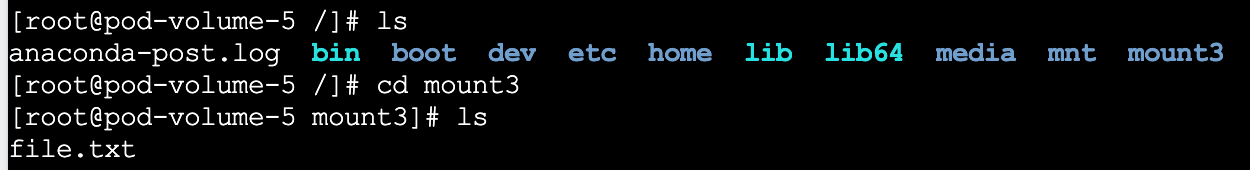 위 PV에서 local의 path를 /node-v 로 했고, k8s-node1으로 설정했습니다. 위의 결과로 PV 3개 생성이 되었고, 각 PVC에 맞는 PV가 바운드 되었습니다. 그리고 Pod를 생성 후 pvc-01과 연결한 후 해당 pod인 pod-volume-5로 들어가본다면, mount3 폴더가 존재하고, 이 안으로 들어가게 되면 hostPath에서 실습을 진행했던 해당 txt 파일을 아래와 같이 존재하는 것을 확인할 수 있습니다.