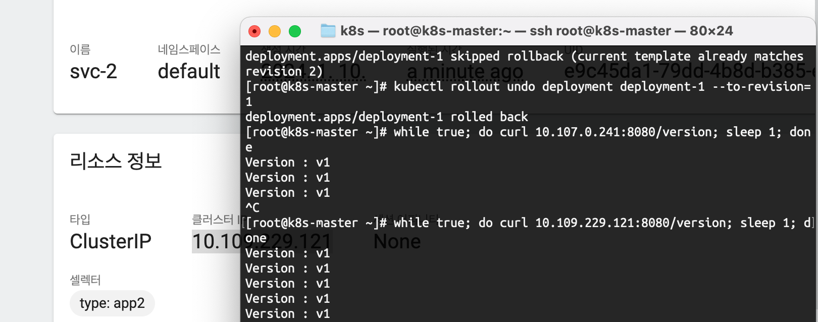 ReCreate와 같이 업데이트 할 준비를 위 그림으로 확인했습니다. 참고로 svc-2는 다른 1과 당연히 다른 ClusterIP 이기 때문에 주의해주세요!! v1 -> v2 버전으로 변경을 하고, 실행해보면 v2 버전의 Pod가 1개씩 생성되면서, v1의 Pod는 1개씩 죽을겁니다. 결국 나중에는 v2의 Pod만 남아있게 되겠죠.
