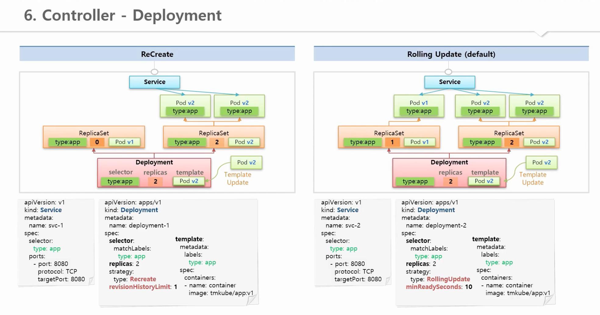 이렇게 일반적으로 사용되는 배포 방식과 k8s에서 이것을 어떻게 사용할 수 있는지 설명했는데 ReCreate, Rolling Update에 대해 자세하게 알아볼 것 입니다. Blue/Green은 실습 때 확인하겠습니다.