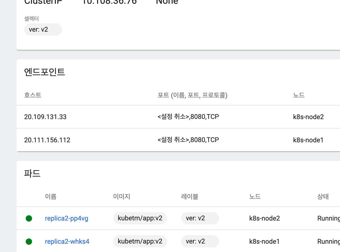 ReplicaSets와 서비스를 1개씩 생성하고, ReplicaSets를 한개 더 추가하는데 v2로 셀렉터와 Label을 수정해줍니다. 그리고 svc-3에서 초기에는 v1과 관련된 라벨을 가진 Pod를 지니고, 셀렉터의 설정이 v1이었지만 다운타임 없이 위처럼 바로 변경되는 것을 확인 할 수 있습니다.