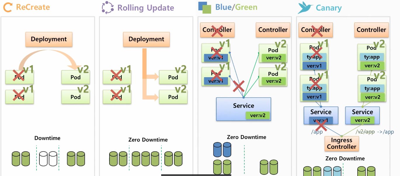 Deployment는 현재 한 서비스가 운영 중인데 이 서비스를 업데이트 해야 돼서 재배포를 해야 할 때 도움 주는 컨트롤러 입니다. 크게 아래와 같이 4가지 방식이 있습니다.