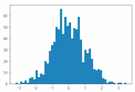 ax.hist(data, bins=50) # 1000개의 데이터를 뽑았는데 50개의 막대로 나타낸다는 것