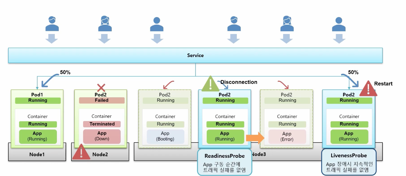 2) 만약에 하나의 앱이 장애가 생겼다고 가정했을 때, Pod는 Running 상태입니다. 예로 서비스를 Tomcat으로 돌릴 때 위에 실행되고 있는 앱에 메모리 오버플로우라든지 문제가 생겨서 접속을 하면 500 서버 에러가 나는 경우가 있죠. 이때 앱에 장애 상황을 감지해주는 것이 LivenessProbe인데, 마찬가지로 Pod를 만들 때 이를 달아주면 앱에 문제가 생길시 Pod를 재실행하게 만들어서 잠깐의 트래픽 에러는 발생하겠지만, 지속적 에러 상태 나는 것을 방지해줍니다.