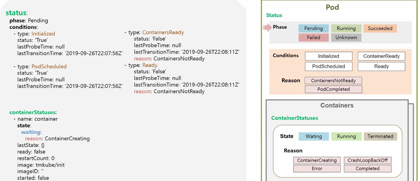 status 안에 Phase라고 해서 Pod의 전체 상태를 대표하는 속성이 있습니다. 그리고 Pod가 생성되면서 실행하는 단계들이 있는데 그 단계와 상태를 알려주는 것이 Conditions라는 특성입니다. 또한 컨테이너마다도 State라고 해서 각각의 컨테이너를 대표하는 상태가 있습니다.