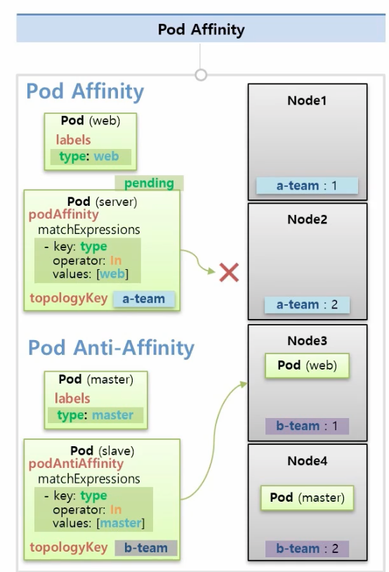 Pod Affinity는 위처럼 노드들이 있고, 두 노드는 a 팀이라는 Key를 가진 라벨을, 남은 두 노드는 b 팀이라는 Key를 가진 라벨이 담겨있습니다. Pod Affinity는 type 웹이라는 라벨을 가진 웹 Pod가 스케줄러에 의해 노드1에 할당 됐습니다. 그럼 웹 Pod와 같은 노드에 Pod를 넣으려면 위처럼 podAffinity라는 속성으로 match Expressions가 있는데, 이번에는 이 match Expressions는 노드의 라벨을 가리키는게 아니라 Pod의 라벨과 매칭되는 조건을 찾습니다. 그래서 웹 Pod와 같이 노드 1에 할당될 수 있는데, 밑에 topologyKey는 노드의 키를 봅니다. 즉 match Expressions에 있는 조건의 라벨을 가진 파드를 찾지만 노드의 Key가 a팀에 있는 범위 내에서만 찾겠다는 내용입니다.