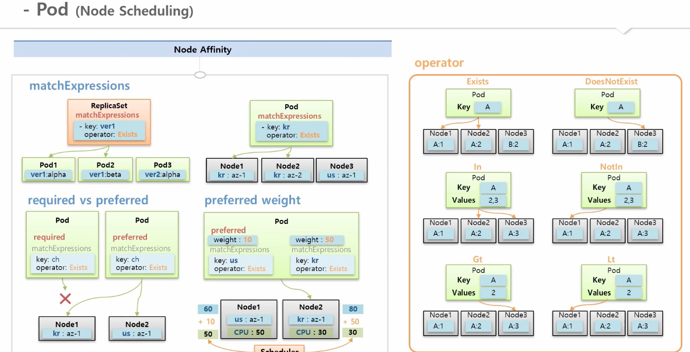preferred 옵션을 달면 해당 Key가 없더라도 적절한 노드에 할당이 됩니다. preferred 속성에는 웨이트 라는 필수 값이 있는데 이 값에 대해서 설명을 하자면, Key가 다른 라벨을 가진 2개의 노드가 있고, CPU는 50 vs 30으로 노드 1이 더 많다고 가정합니다. 그리고 preferred 속성을 가진 Pod를 만드는데 두 노드에 키가 모두 있기 때문에 두 노드 중 Cpu 자원이 많은 노드 1에 할당이 될텐데 이때 웨이트의 옵션을 설정할 수 있습니다. 선호도에 대한 가중치를 주는 건데 이 Pod는 Key가 Us, kr인 노드에 할당이 될 수 있지만, 그래도 Key가 kr인 노드에 가중치를 좀 더 주겠다고 설정을 한 것입니다. 그러면 스케줄러는 최초 Cpu 자원을 보고 점수를 매겨놔서 노드1에 할당을 시키려고 했지만, Pod의 가중치가 합산이 돼서 60 vs 80으로 노드2에 Pod를 할당시킵니다. 계산이 이렇게 간단하지만 대략적으로 한 것이니 가볍게 넘어가시면 됩니다.