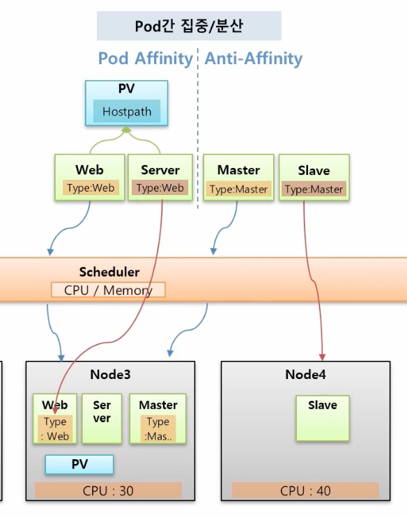 Pod [ Affinity, Anti-Affinity ]는 여러 Pod들을 한 노드에 집중해서 할당을 하거나, 겹치는 노드없이 분산을 해서 할당할 수 있습니다. 예로 웹, 서버가 있는데 이 2개의 Pod는 한 PV에 연결이 되어있고, 이 PV가 Hostpath를 사용한다고 했을 때 이 2개 Pod는 같은 노드 상에 있어야만 문제가 없게 됩니다. 그래서 이 2개 Pod를 같은 노드에 할당 하려면 Pod Affinity을 사용해야 하는데 웹 Pod가 스케줄러에 의해 특정 한 서버에 할당이 되면 그 Hostpath에 PV가 생깁니다. 그러면 서버 Pod가 웹 Pod에 있는 노드에 들어가려면 Pod를 만들 때 Pod Affinity 속성을 넣고 웹에 있는 라벨을 지정하면 됩니다. 그럼 이 서버 Pod도 웹 Pod가 있는 노드로 할당됩니다.