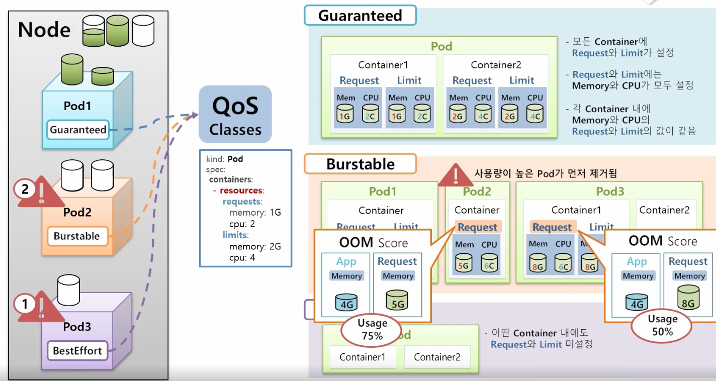 위 Qos는 노드에 이렇게 리소스가 있다고 가정하고, 이 노드 위에 Pod가 3개 만들어져서 자원을 모두 사용하고 있는 상태라고 가정합니다. 이 상태에서 Pod1이 추가적으로 자원이 필요할 때 노드에는 추가적으로 할당받을 수 있는 자원이 없기 때문에, 선택을 해야합니다. k8s는 앱의 중요도에 따라 이런 것을 관리할 수 있도록 3가지 단계로 Quality of Service를 지원해주고 있습니다.