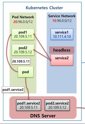 2번째로 Pod1, Pod2를 선택해서 연결하고 싶을 때는 Pod에 headless Service를 연결하게 되면 DNS 서버에 Pod의 이름과 서비스의 이름이 붙여져서 도메인 이름으로 등록이 되기 때문에, Pod 입장에서는 Pod1에 접근하기 위해 IP 주소는 필요없고 DNS의 이름으로 접근할 수 있습니다.