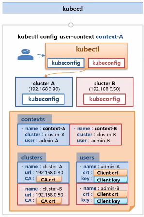 이렇게 있다면 contexts 항목으로 이 둘을 연결할 수 있는데 내용으로는 contexts 이름, 연결할 클러스터와 유저 네임이 있습니다. 이렇게 클러스터 A에 대한 contexts가 만들어졌고, 마찬가지로 클러스터 B에 대해서도 등록을 할 수 있습니다. 만약 클러스터 A에 연결하고 싶다면 kubectl config user-context context-A 라는 kubectl config 명령으로 현재 사용하고 싶은 context를 지정할 수 있습니다.