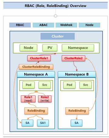 쿠버네티스가 자원에 대한 권한을 부여하는 방법에서는 여러가지가 있지만 RBAC을 많이 사용합니다. 역할 기반으로 권한을 부여하며, Role과 RoleBinding이라는 오브젝트가 그 기능을 합니다. 1) 클러스터 내에는 Node, PV, Namespace 같이 클러스터 단위로 관리되는 자원과 2) Pod, Service와 같이 Namespace 단위로 관리되는 자원으로 나눌 수 있습니다.