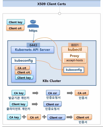 또한 k8s 설치할 때 kubectl도 설치를 하고, 설정 내용에 kubeconfig 파일을 통째로 kubectl에서 사용하도록 복사를 하는 과정이 있는데, 이렇게 했기 때문에 kubectl로 k8s API에 인증이 돼서 리소스들을 조회할 수 있습니다. accept-hosts 옵션으로 8001번 포트로 proxy를 열어두면 외부에서도 http로 접근할 수 있게 되는데 kubectl이 인증서를 가지고 있기 때문에 사용자는 아무런 인증서 없이 접근이 가능합니다.