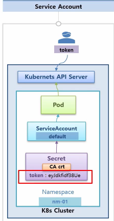 위와 같이 k8s Cluster, k8s API 서버가 있고, Namespace를 만들게 되면 기본적으로 default 라는 이름의 Service Account가 자동으로 만들어집니다. 이 안에는 Secret이 하나 달려있는데 내용으로 CA crt 정보와 토큰값이 들어있습니다. Pod를 만들면 이 서비스 어카운트 연결이 되고 Pod는 이 토큰값을 통해 API 서버에 연결할 수 있는데, 결국 토큰값만 알면 사용자도 이 값을 가지고 API 서버에 접근할 수 있습니다.