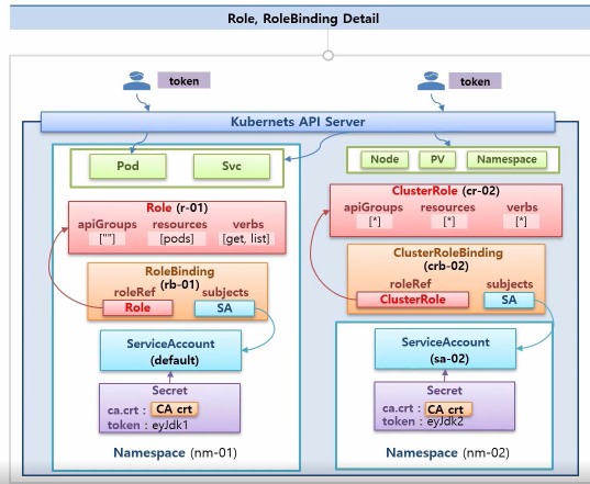 Role은 여러개를 만들 수 있고, 각 Role에는 Namespace 내에 있는 자원에 대해서 조회만 가능하거나 생성만 가능하도록 권한을 줄 수 있습니다. RoleBinding은 Role, Service Account로 연결해주는 역할인데 Role은 하나만 지정할 수 있고, Service Account는 여러개 지정이 가능합니다. 위를 예시로 SA, SA1은 Role1 권한으로 API 서버에 접근할 수 있게 됩니다.