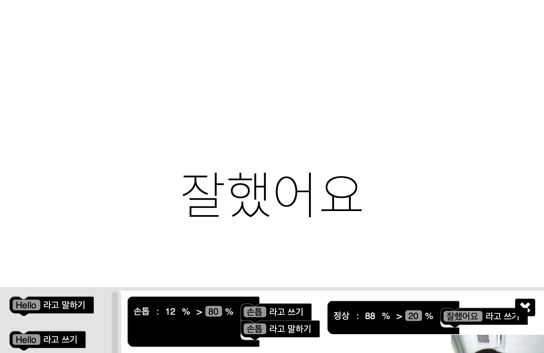 손톱 수치에는 위와 같이 80% 이상일 때 손톱이라고, 화면에 쓰게 하고 말하게 합니다. 반대로 정상에는 20% 이상일 때는 화면에 잘했어요 라는 문구가 뜨게 합니다. 이 작업은 우리가 손톱을 깨물었는지 판단해주는 모델을 응용해서 애플리케이션 또는 프로그램을 간단히 만들어 경험해 본 것입니다.