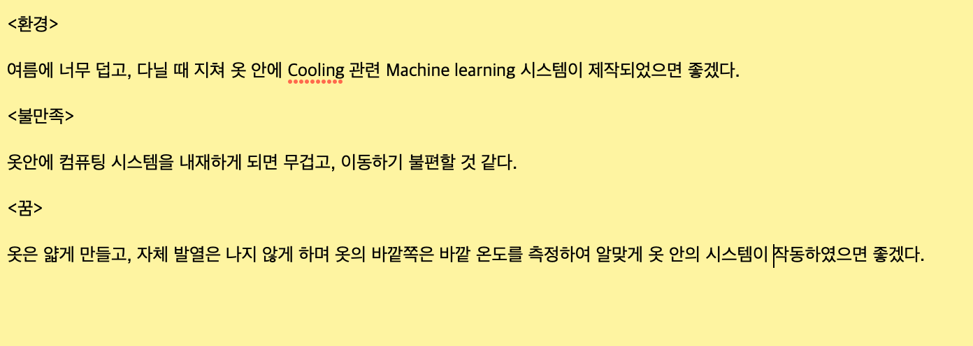 간단하고 재밌는 실습을 하나 해보았는데 기술적인 한계는 고려하지 않습니다. 천천히 주변에서 일어나는 일을 떠올려 보고, 그중 왠지 머신러닝으로 해결할 수 있을 것 같은 문제를 찾아봅시다. 저도 하나 적어보았습니다. 여러분도 해보세요.