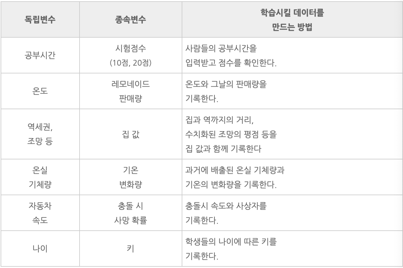 위의 '레모네이드 카페'의 예제 같은 경우, 회귀는 예측하고 싶은 종속변수가 숫자일 때 보통 회귀라는 머신러닝의 방법을 사용합니다. 옆의 표는 Regression의 여러 사례들을 나타낸 것입니다.