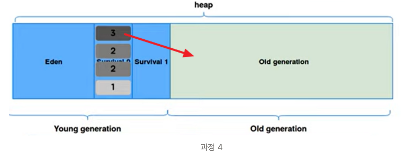 한번 GC가 실행될 때마다 살아남은 각 객체들 고유의 age 값이 증가하게 되고 age의 값이 특정 임계치를 넘어가기 전까지 GC가 실행될 때마다 Survival0과 Survival1을 반복하며 이동한다.