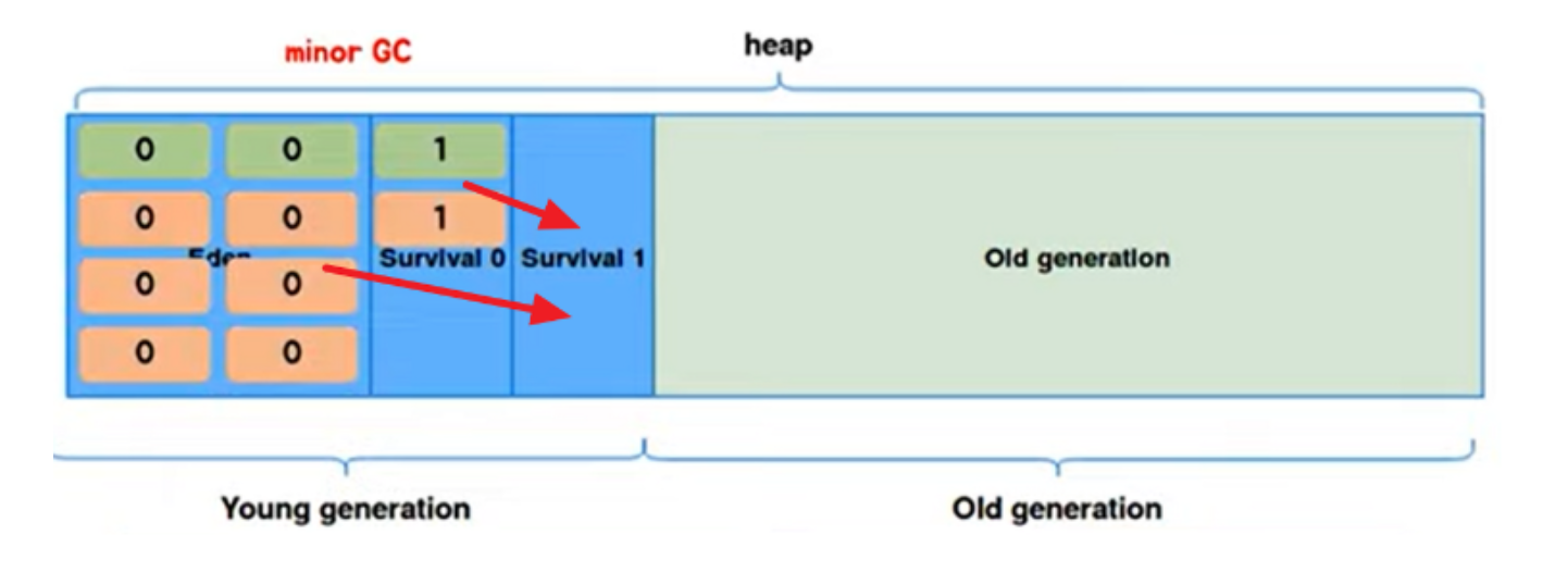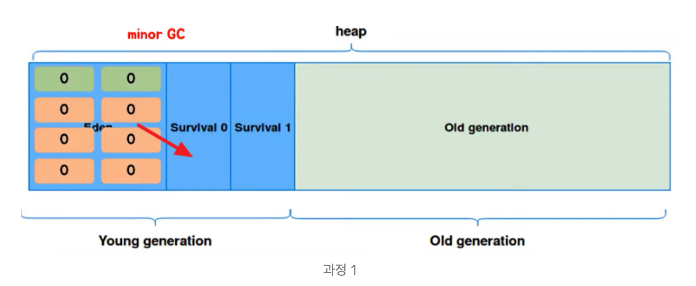 Young generation은 다시 Eden, Survival0, Survival1 3가지 영역으로 나뉘는데 새로운 객체들은 Eden 영역에 할당되며 Eden 영역이 꽉 차게 되면 Minor GC 가 실행된다.