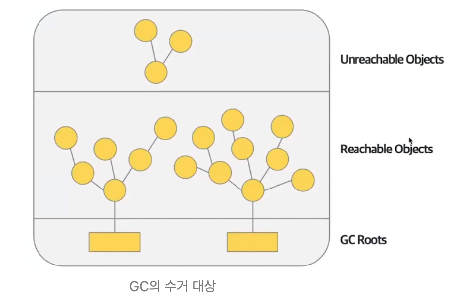 이때 GC Roots는 stack 영역의 데이터, method 영역의 static 데이터, JNI(네이티브 메서드 인터페이스)에 의해 생성된 객체들을 예시로 들 수 있다.
