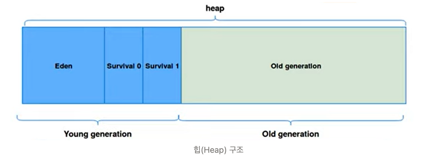 힙(Heap) 영역은 다음과 같이 Young generation, Old generation 두 가지로 나뉘고, Young generation에서 일어나는 GC를 Minor GC, Old generation는 Major GC라 한다. Young generation는 새로운 객체들이 할당되는 영역, Old generation은 Young generation에서 오랫동안 살아남은 객체들이 존재하는 영역이다.