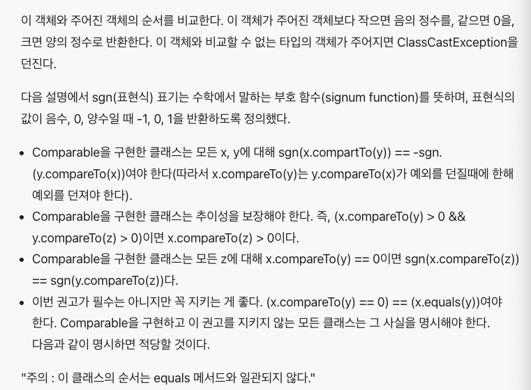 위 3가지 규약은 compareTo 메서드로 수행하는 동치성 검사도 equals 규약과 똑같이 반사성, 대칭성, 추이성을 충족해야 함을 뜻한다. 추가로 compareTo의 마지막 규약은 필수는 아니지만 꼭 지키길 권한다. 마지막 규약은 compareTo 메서드로 수행한 동치성 테스트의 결과가 equals와 같아야 한다는 것이다.