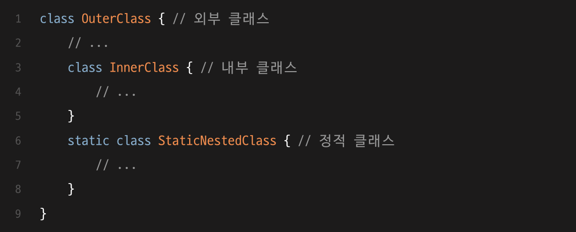 중첩 클래스는 말 그대로 클래스 내에 정의된 클래스를 뜻한다. 추가로 중첩 클래스는 다시 static으로 선언되지 않은 중첩 클래스인 내부 클래스와 static으로 선언된 중첩 클래스인 정적 클래스로 나뉜다.