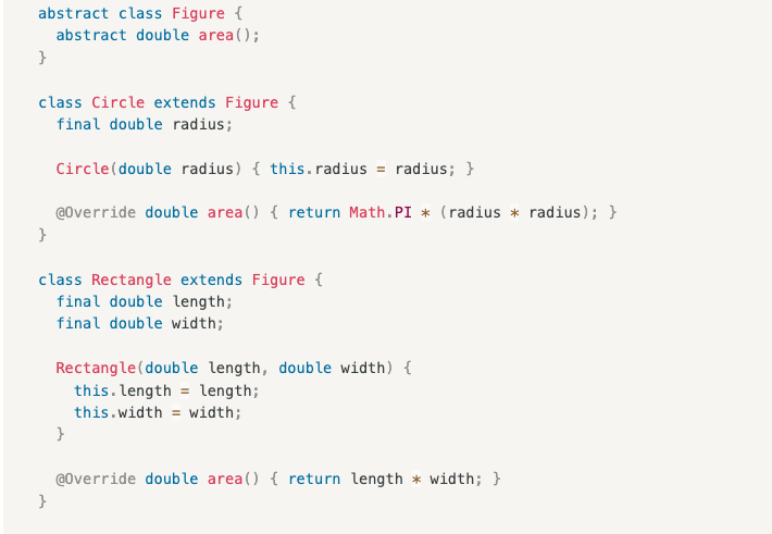 아래 코드는 태그 달린 클래스의 단점을 모두 날려버린다. 살아남은 필드들은 모두 final이고, 루트 클래스의 코드를 건드리리 않고도 다른 프로그래머들이 독립적으로 계층 구조를 확장하고 함께 사용할 수 있다. 타입이 의미별로 따로 존재하니 변수의 의미를 명시하거나 제한할 수 있고, 특정 의미만 매개변수로 받을 수 있다. 또한 타입 사이의 자연스러운 계층 관계를 반영할 수 있어서 유연성은 물론 컴파일타임 타입 검사 능력을 높여준다는 장점도 있다.