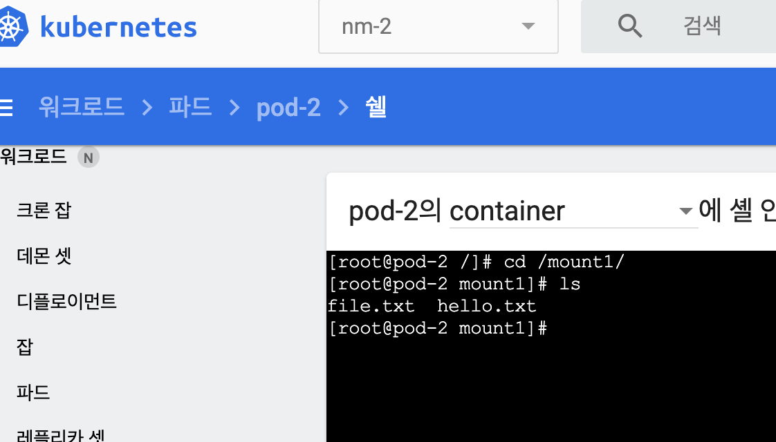 (5) 위는 nm-1 에서 hostPath 사용해서 hello.txt 파일을 만들고, nm-2에서 해당 /mount1로 접근해보면 파일이 존재하는 것을 확인할 수 있습니다. 기본적으로 Pod의 권한을 root로 사용하기 때문에 유저 권한을 주도록 변경이 필요한 부분입니다. 그래서 주의할 내용은 네임 스페이스의 분리 기능에 대해 기본적으로 제공하는 기능과 못하는 기능, 추가적인 object를 통해 분리 설정해야 하는 부분이기에 이런 것을 잘 확인하고 사용해야 합니다.