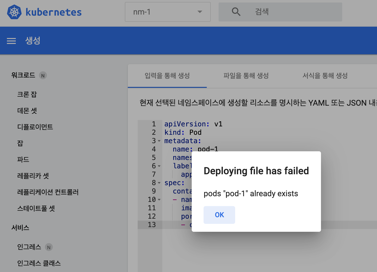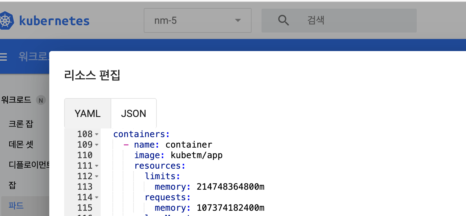 Dashboard에서는 확인이 안되고, 명령어를 통해 확인해야 합니다. 만약 리소스 커터가 적용되어 있는 네임 스페이스에 이 Pod를 만들 때 리소스 부분을 빼고 만들게 되면 반드시 명시하라고 경고가 나옵니다. 또한 리소스 커터의 제한되어 있는 양을 넘으면 경고 메세지가 표시 됩니다. 또한 Pod 개수를 제한할 수 있는데, 이 또한 초과해서 생성하려고 하면 에러 문구가 나옵니다.
