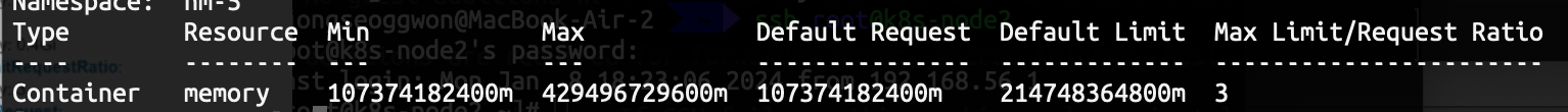 이 또한 명령어를 통해 확인해야 합니다. 만약 LimitRange에서 설정한 값보다 큰 Pod의 limit와 Request 비율을 생성하려고 하면 위처럼 에러 문구가 나오는 것을 볼 수 있습니다.