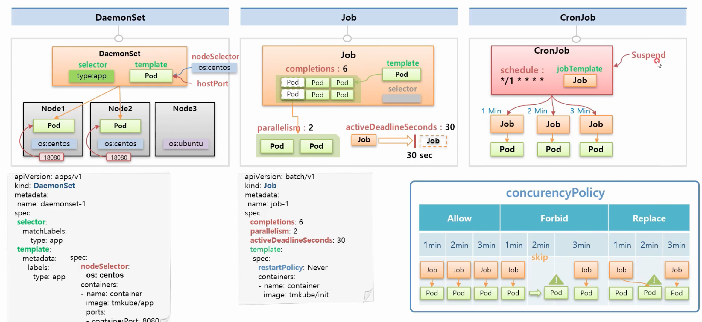 : Job Template이 있어서 이 내용을 통해서 Job을 만들어 주고 스케줄이 있어서 이 시간을 주기로 Job을 만드는데 이 포맷은 흔히 사용하는 크론 포멧입니다. 위는 1분에 1개 Job을 만든다는 의미, 이렇게 1분 간격으로 Job이 생성되고 Job은 또 자신의 역할인 Pod를 만들게 됩니다. concurrencyPolicy라는 기능이 있는데 Allow, Forbid, Replace 3가지 옵션이 있습니다. 일반적으로 policy를 설정하지 않으면 Allow가 Default 입니다. 이러한 옵션들로 인해 CronJob은 Job을 더 정교하게 다룰 수 있고, 이 밖에 실행중인 Job을 일시 정지시키는 작업이나 Manual, Trigger 하는 부분이 있는데 이것은 실습 때 해보도록 하겠습니다.